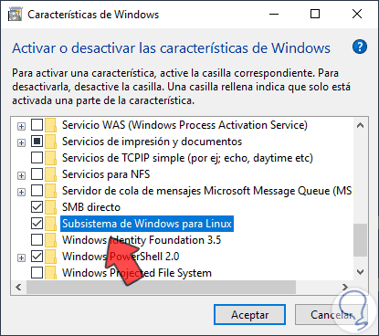 Damos clic en “Activar o desactivar las características de Windows” y en el asistente activamos la casilla “Subsistema de Linux”: