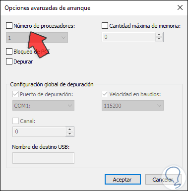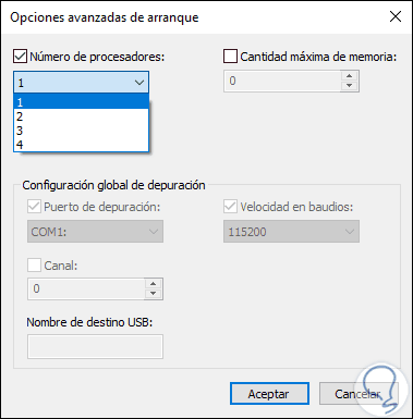 Allí activamos la casilla “Número de procesadores” y seleccionamos la cantidad de núcleos que deseamos usar extra en Windows 10: