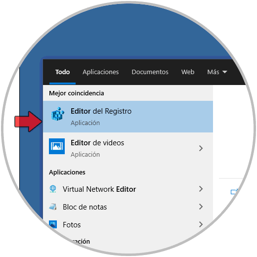 Esta opción aplica a todas las ediciones de Windows 10, para ello ingresamos “editor” en el cuadro de búsqueda y en los resultados seleccionamos “Editor del registro”:
