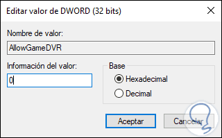 Este valor lo llamaremos “AllowGameDVR”. Damos doble clic o clic derecho / Modificar y en el campo “Información del valor” establecemos el número 0. Guardamos los cambios.