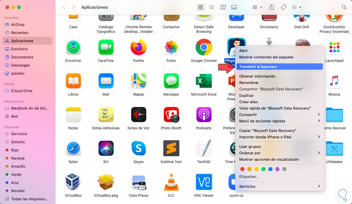 Después de esto podemos ver todas las aplicaciones instaladas en el sistema, damos clic derecho (Ctrl + clic) sobre la aplicación a eliminar y en el menú desplegado seleccionamos “Transferir al basurero”: