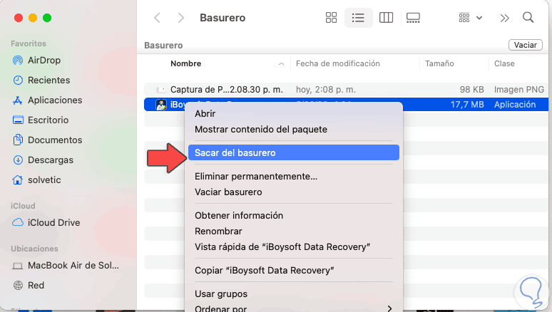 Antes de borrar la aplicación si por alguna razón nos arrepentimos de borrarla bastara con ir al basurero, dar clic derecho sobre ella y seleccionar la opción “Sacar del basurero”: