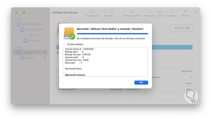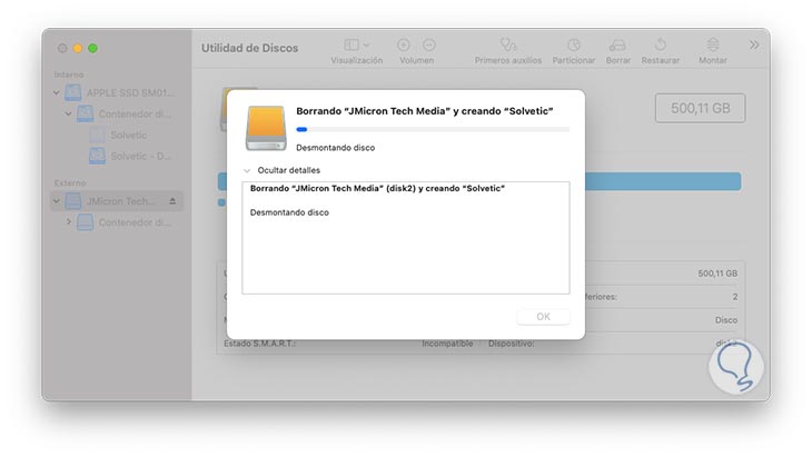 Para este caso seleccionamos ExFAT para que el disco pueda ser usado en macOS y Windows. Damos clic en “Borrar” y se iniciará el proceso de formato del disco duro externo en macOS Big Sur: