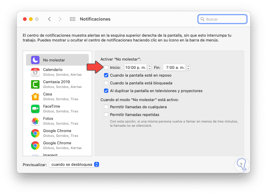 Para activar No molestar en macOS Big Sur debemos activar la casilla “Inicio” y seguidamente establecer el rango horario en el cual estará activo este modo, adicional podemos activar el modo No molestar con la pantalla en reposo o bloqueada.