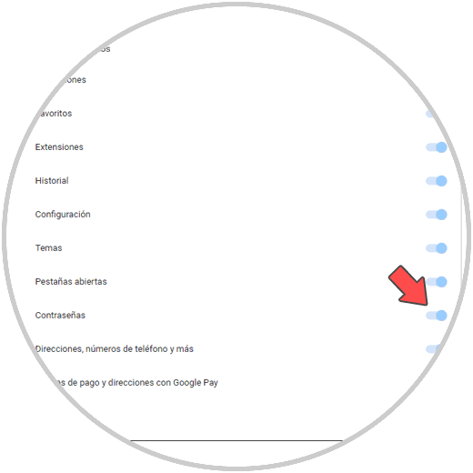 Damos clic en “Administra los datos de la sincronización” y luego comprobamos que el interruptor de “Contraseñas” se encuentre activo: