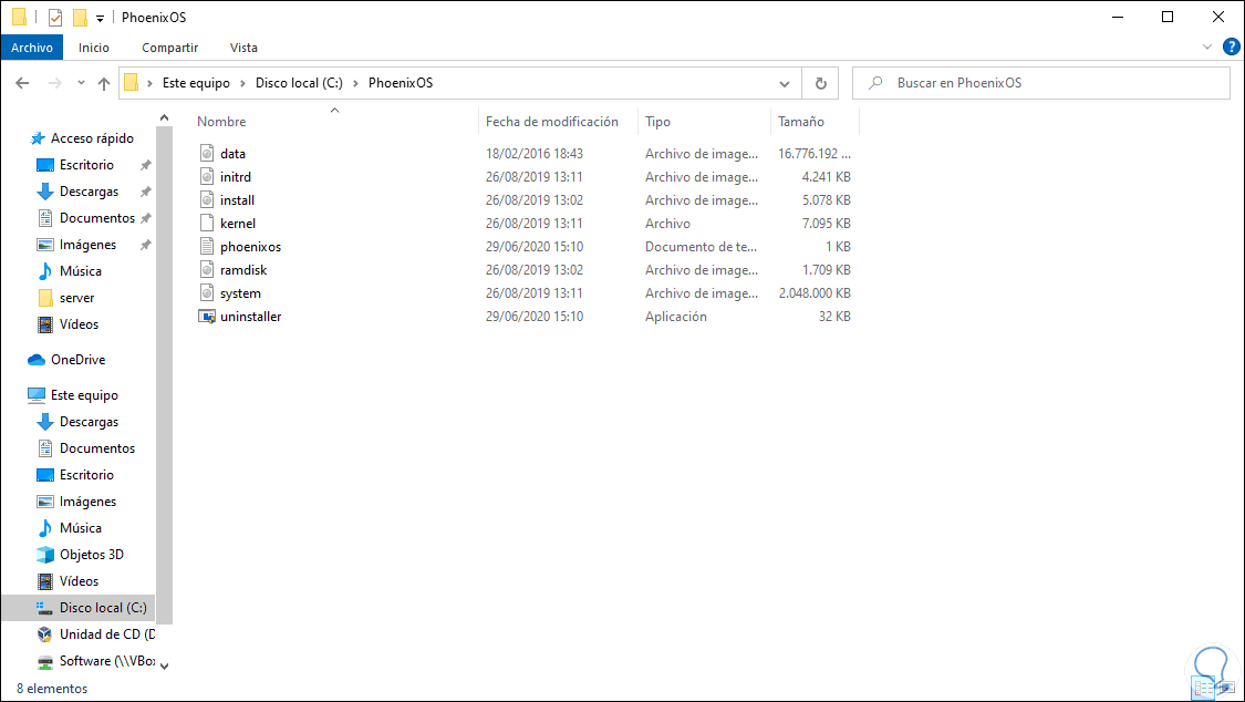 Antes de reiniciar el sistema, vamos al Explorador de Windows 10 y en la unidad C podemos ver que se ha creado la carpeta PhoenixOS con los detalles del sistema: