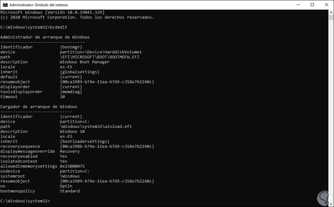 Por último, si deseamos accedemos al símbolo del sistema y ejecutamos “bcdedit” para comprobar: