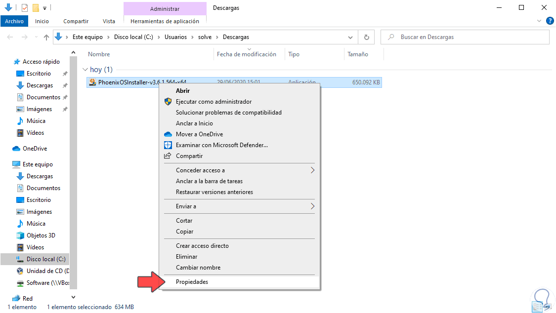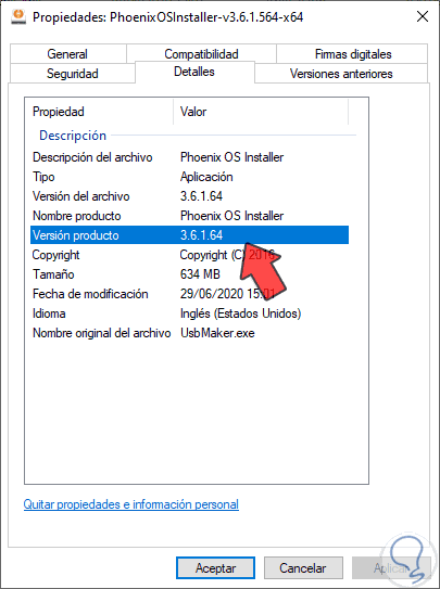 En la ventana emergente vamos a la pestaña “Detalles” y allí veremos los valores del instalador de Android Phoenix OS: