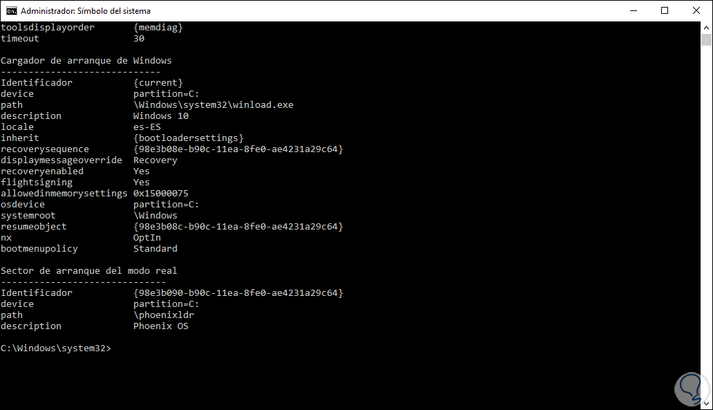 Para comprobar el arranque, accedemos al símbolo del sistema como administradores y ejecutamos “bcdedit”. Podemos ver que en la parte inferior está disponible Phoenix OS.
