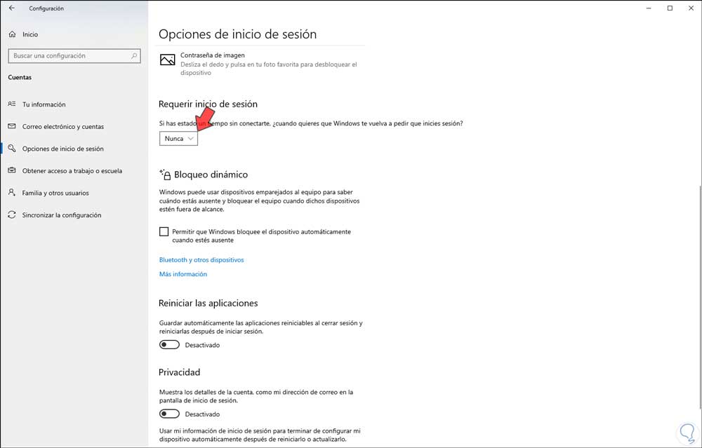 Allí vamos a la sección “Requerir Inicio de Sesión” y vemos que el valor por defecto es “Cuando el PC se activa después de haber estado en suspensión”, allí debemos desplegar el campo disponible y seleccionar “Nunca”: