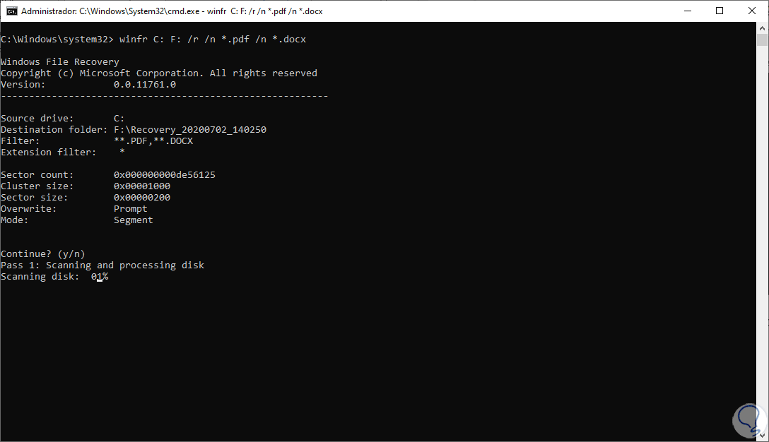 Windows File Recovery nos permite crear segmentos para los resultados, por ejemplo, si deseamos recuperar archivos PDF y WORD desde la unidad C ejecutamos: