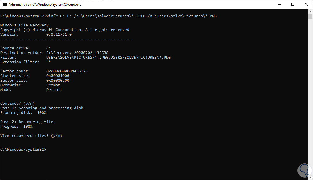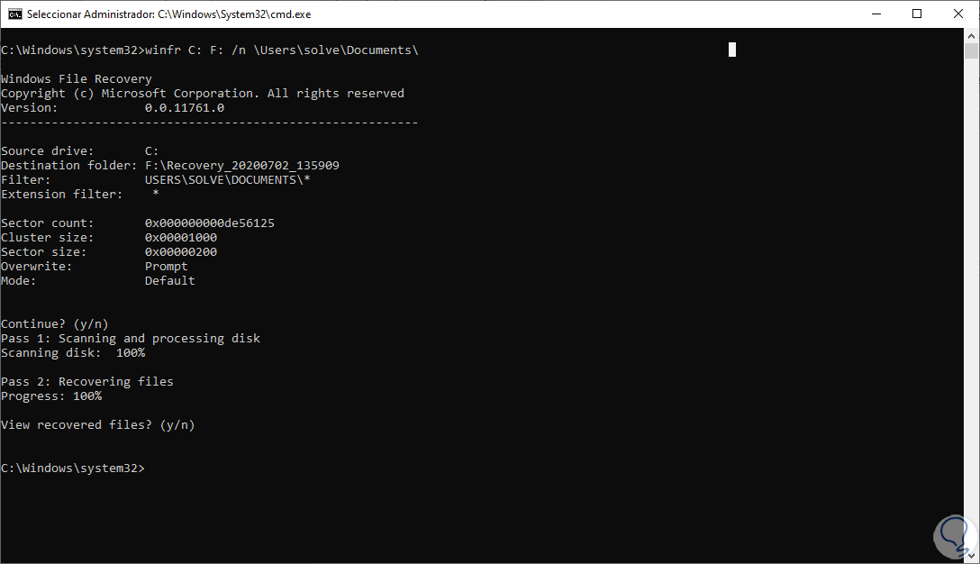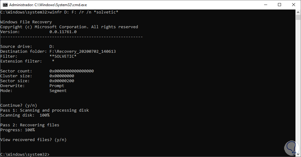 Esto se encarga de ingresar en una carpeta RECOVERY en la unidad F el archivo Solvetic.txt aplicando el filtro \Users\solve\Documents, debemos ingresar “y” para permitir el escaneo y luego se preguntará si deseamos ver los resultados: