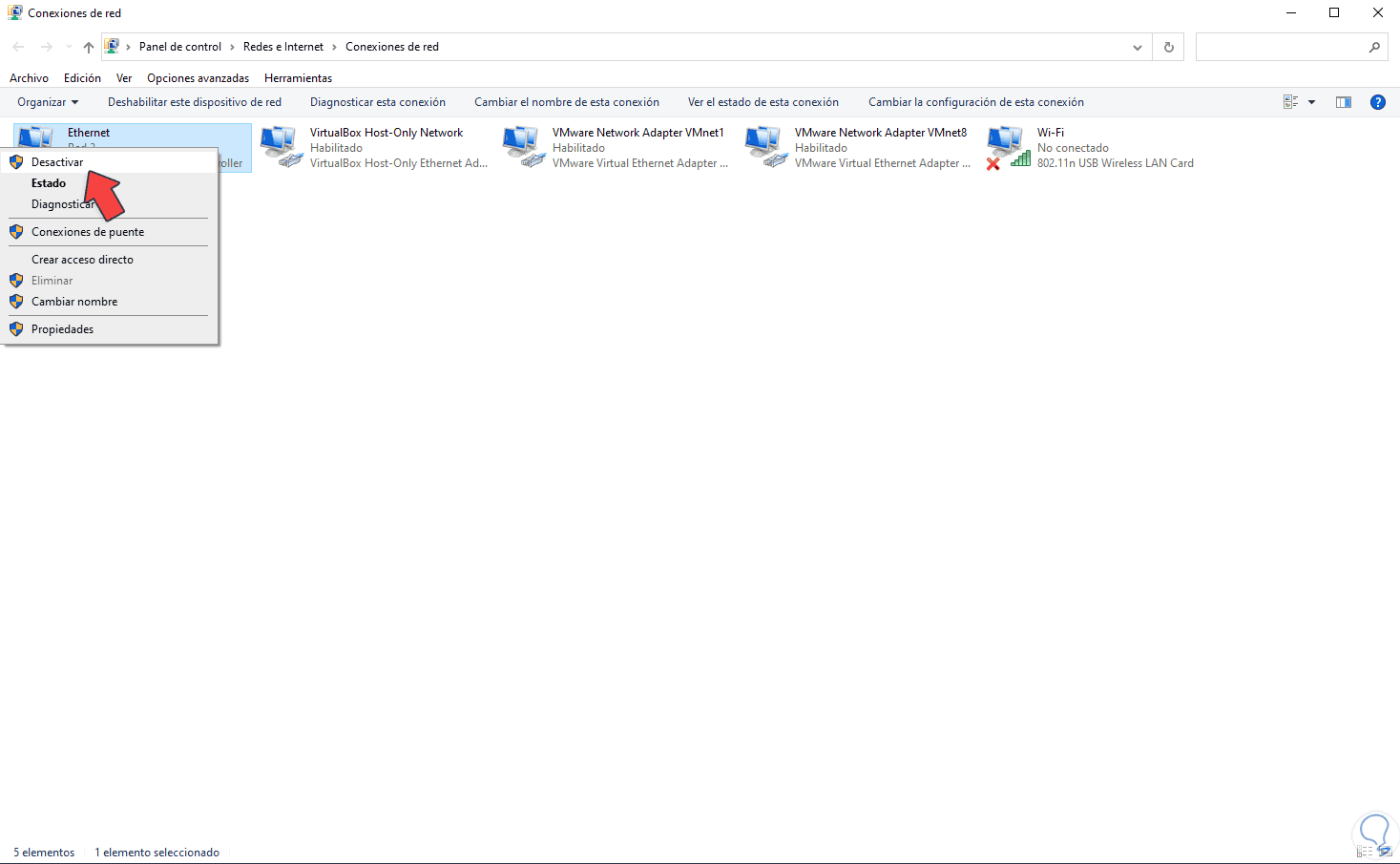 Allí accedemos a “Cambiar configuración del adaptador” y debemos desactivar la conectividad actual (LAN o Wi-FI) dando clic derecho sobre al adaptador y seleccionando “Desactivar”: