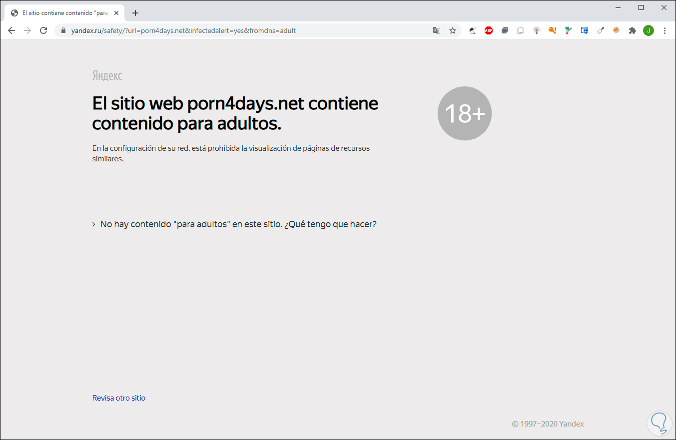 Si intentamos acceder a un sitio web de adultos desde cualquier navegador veremos lo siguiente. Aunque intentemos acceder desde Configuración avanzada será imposible el acceso.