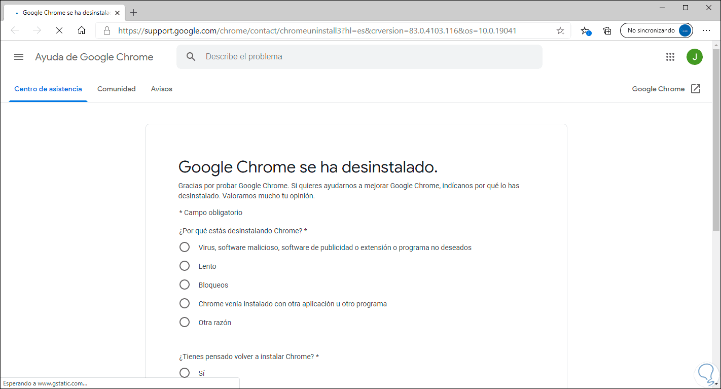 Allí podemos borrar de paso el historial de navegación si lo deseamos, damos clic en “Desinstalar” para completar el proceso, esto abrirá un sitio web donde se preguntará el motivo de la desinstalación: