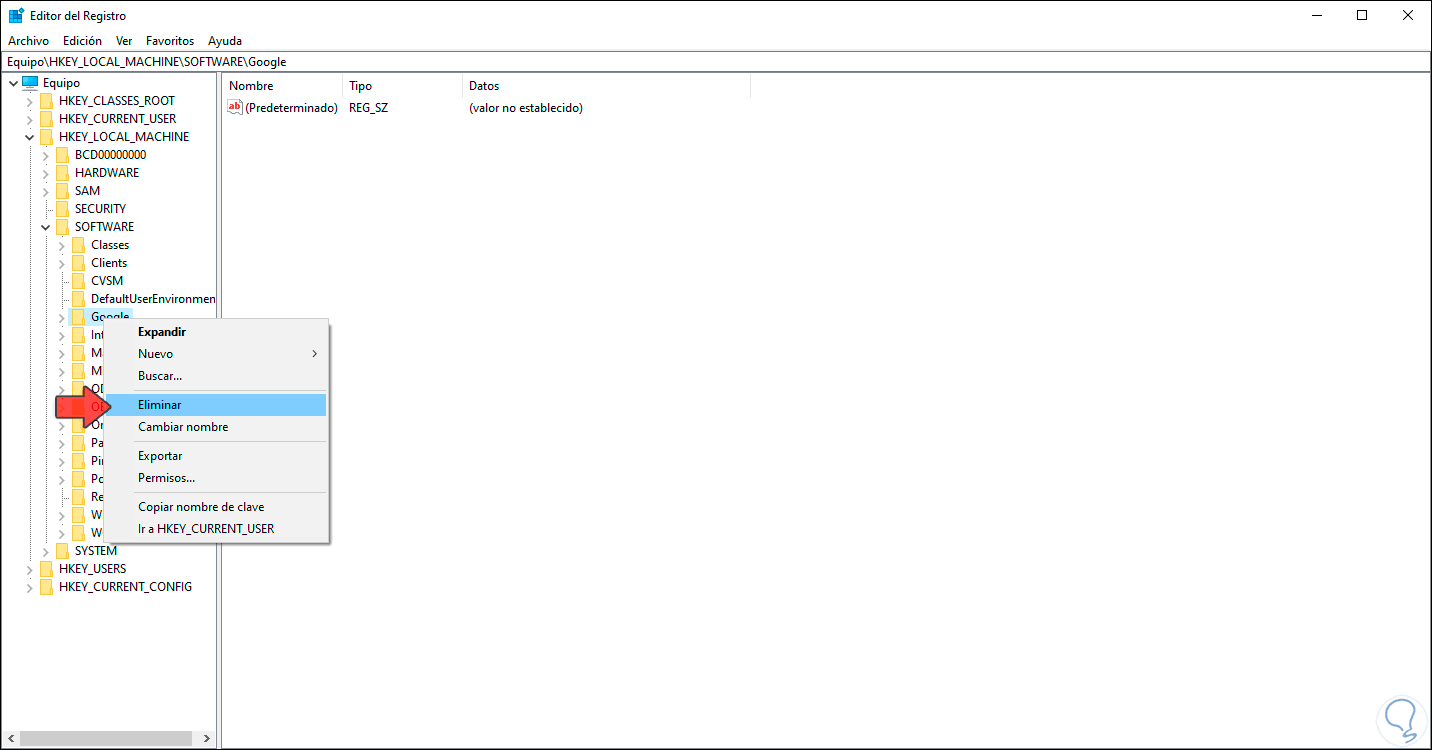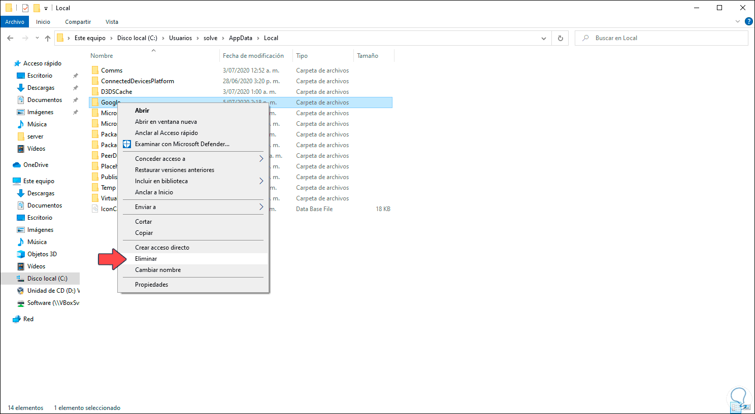 Allí damos clic derecho sobre la carpeta “Google” y seleccionamos “Eliminar”: