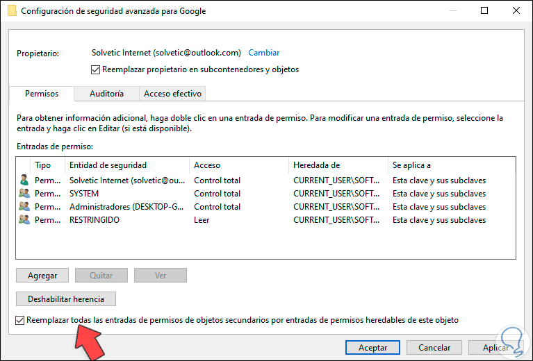 Damos clic en Aceptar y ahora activamos la casilla “Reemplazar propietario en subcontenedores y objetos” y en la casilla “Reemplazar todas las entradas de permisos de objetos secundarios por entradas de permisos heredables de este objeto” en la parte inferior: