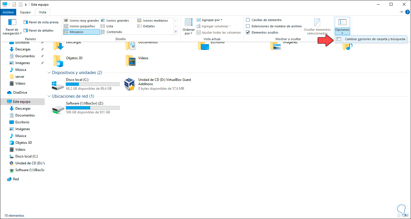 Después de esto accedemos al Explorador de archivos y vamos a “Vista – Opciones – Cambiar opciones de carpeta y búsqueda”: