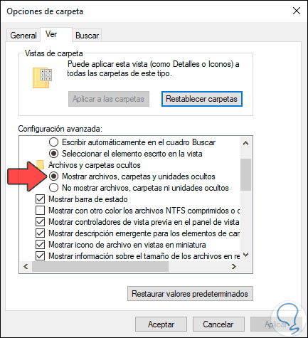 En la ventana desplegada iremos a la pestaña “Ver” y activamos la casilla “Mostrar archivos, carpetas y unidades ocultos”. Damos clic en Aplicar y Aceptar para guardar los cambios.