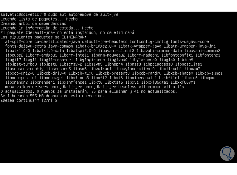 Luego ejecutamos lo siguiente para completar el proceso. Ingresamos de nuevo la letra “S” para confirmar la limpieza de Java en Linux.