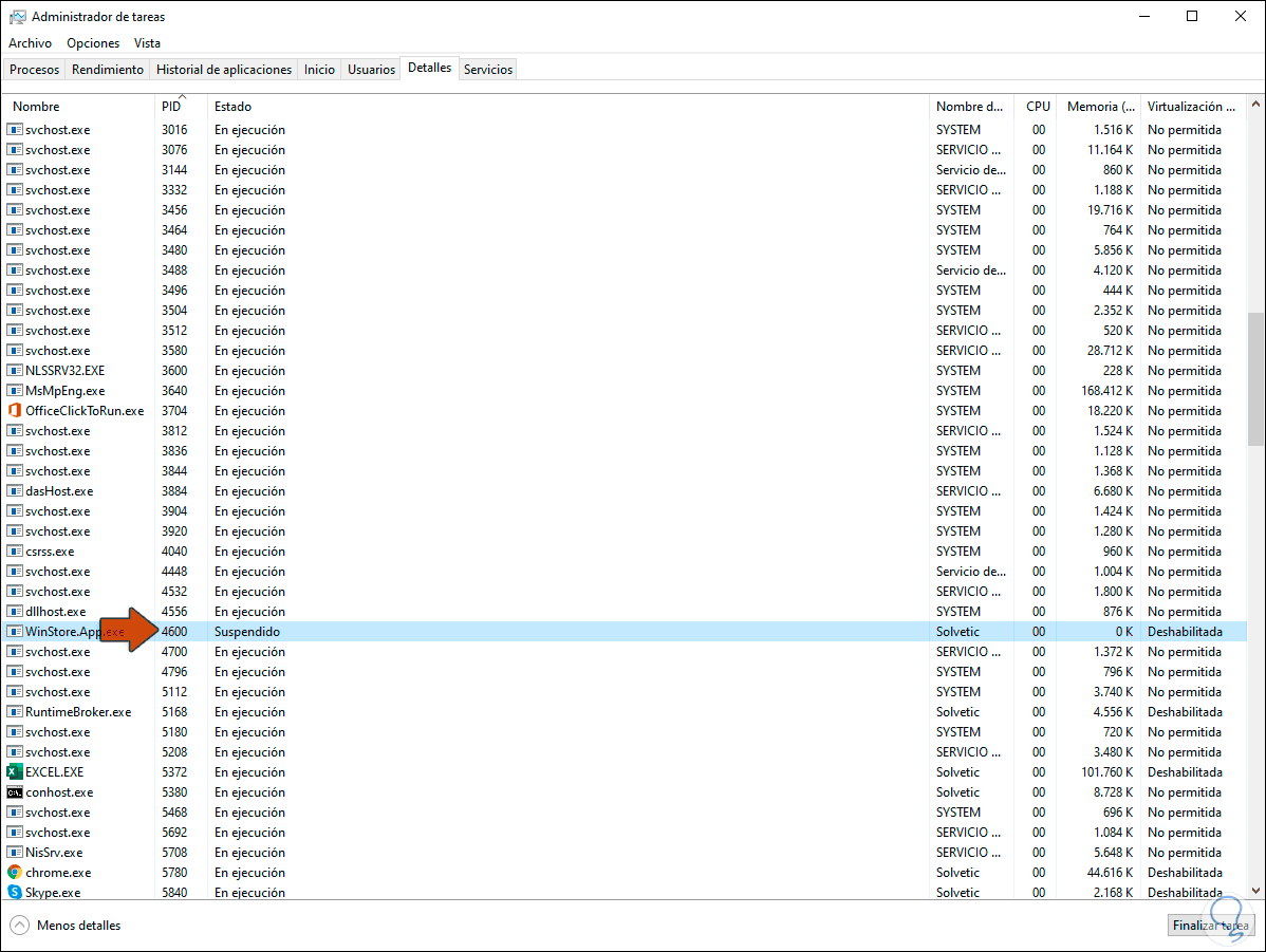 El PID es la última columna desplegada, esto es útil para saber con certeza que programa está usando dicho puerto, por ejemplo, seleccionamos el PID 4600, con este valor en mente vamos al Administrador de tareas y nos dirigimos a la pestaña “Detalles”, pulsamos en la columna PID para ordenarlos y luego veremos que el PID 4600 hace referencia a la Tienda de Windows 10: