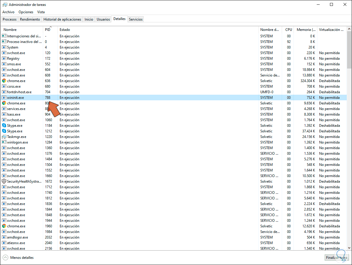 Buscaremos el PID 788 y en el Administrador de tareas vamos a “Detalles” y lo ubicamos: