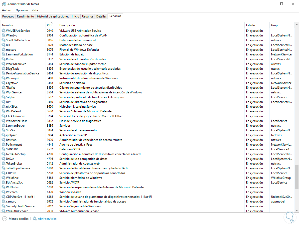 Esto nos redirecciona a la pestaña “Servicios” y si este programa o aplicación está activo lo encontraremos allí: