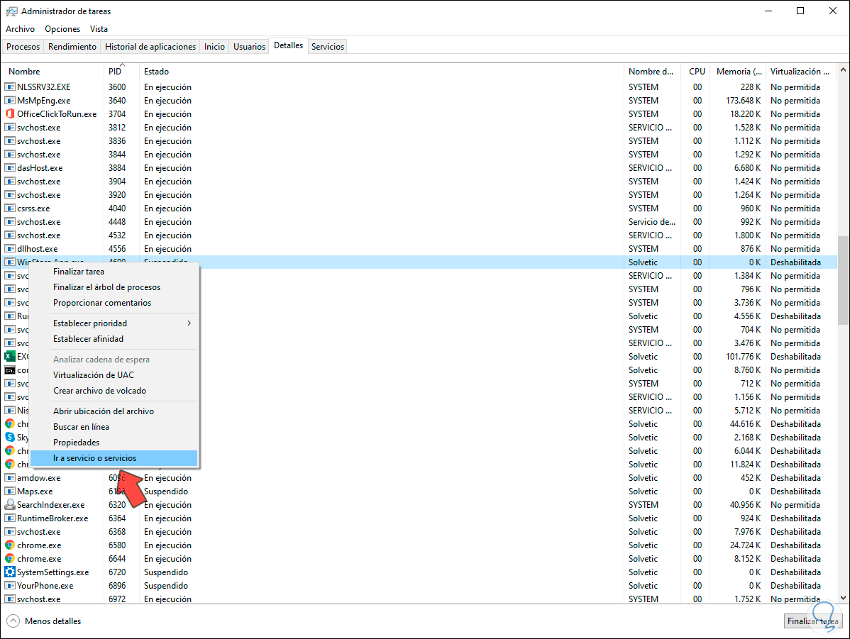 Damos clic derecho sobre dicho PID y seleccionamos “Ir al servicio o servicios”: