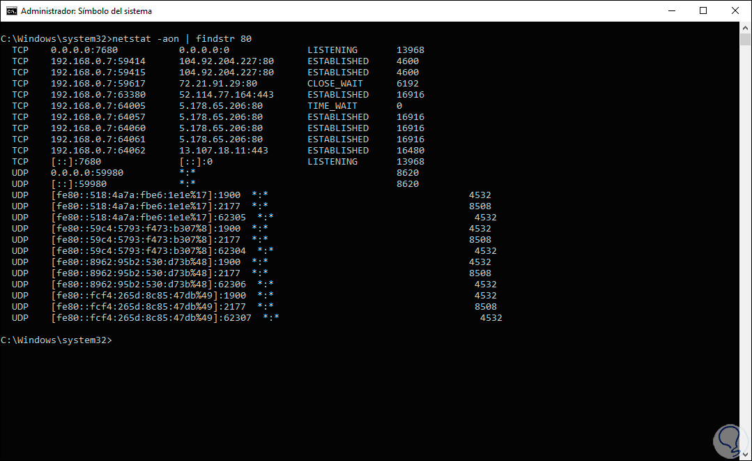 Se ha añadido el parámetro “o” el cual permite ver la identidad de cada proceso (PID) que usa ese puerto, en este caso buscaremos que programas están usando el puerto 80, al pulsar Enter veremos lo siguiente: