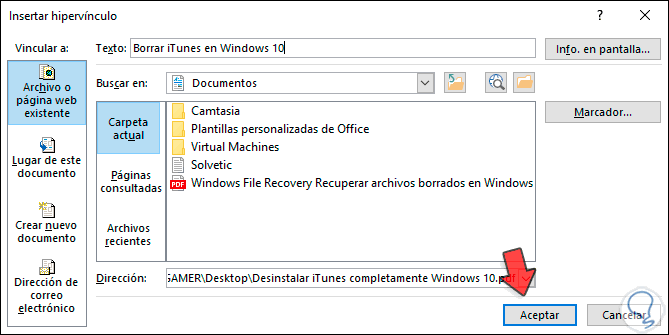 Damos clic en Aceptar y en el campo “Dirección” veremos la ruta al PDF y en el campo “Texto” podemos ingresar la descripción para identificar el archivo: