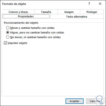En la ventana emergente iremos a la pestaña “Propiedades” y allí será posible definir el comportamiento al mover el objeto en la hoja de cálculo: