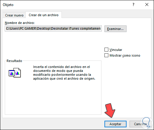 Damos clic en “Insertar” y se integrará el archivo a la ventana emergente: