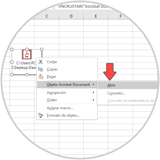 - Dar clic derecho y seleccionar “Objeto Adobe Document – Abrir”