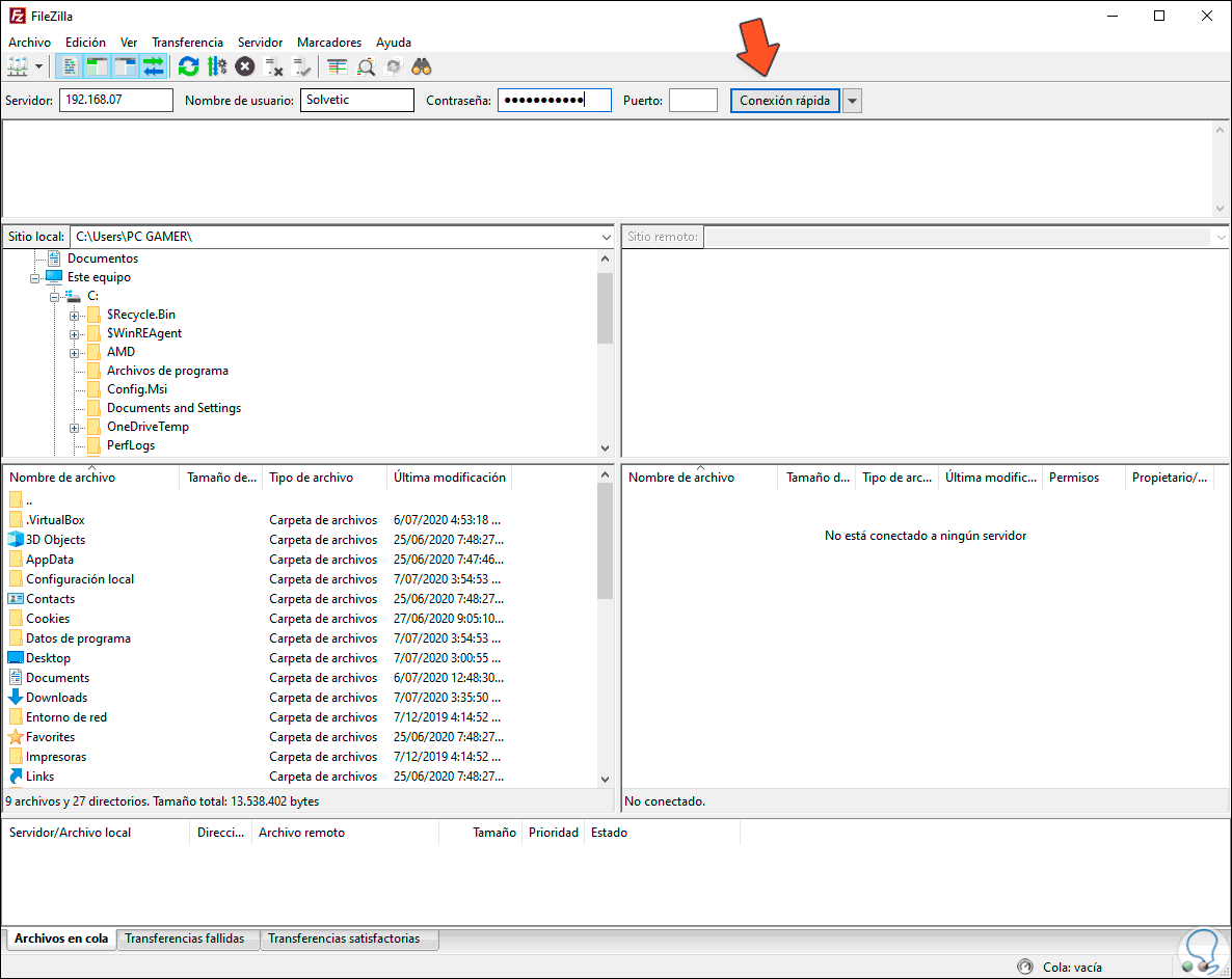 En el campo puerto podemos ingresar el puerto 21 de FTP, damos clic en “Conexión rápida” y vemos que la conexión se ha establecido: