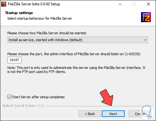 En la siguiente ventana es posible definir el puerto a usar (recomendamos dejar el puerto por defecto) y establecer si FileZilla se iniciara como un servicio del sistema: