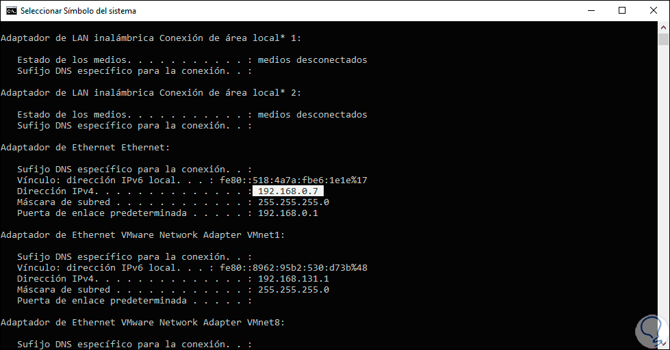 Accedemos al símbolo del sistema y allí ejecutamos el comando “ipconfig” con el fin de verificar la dirección IP del equipo local:
