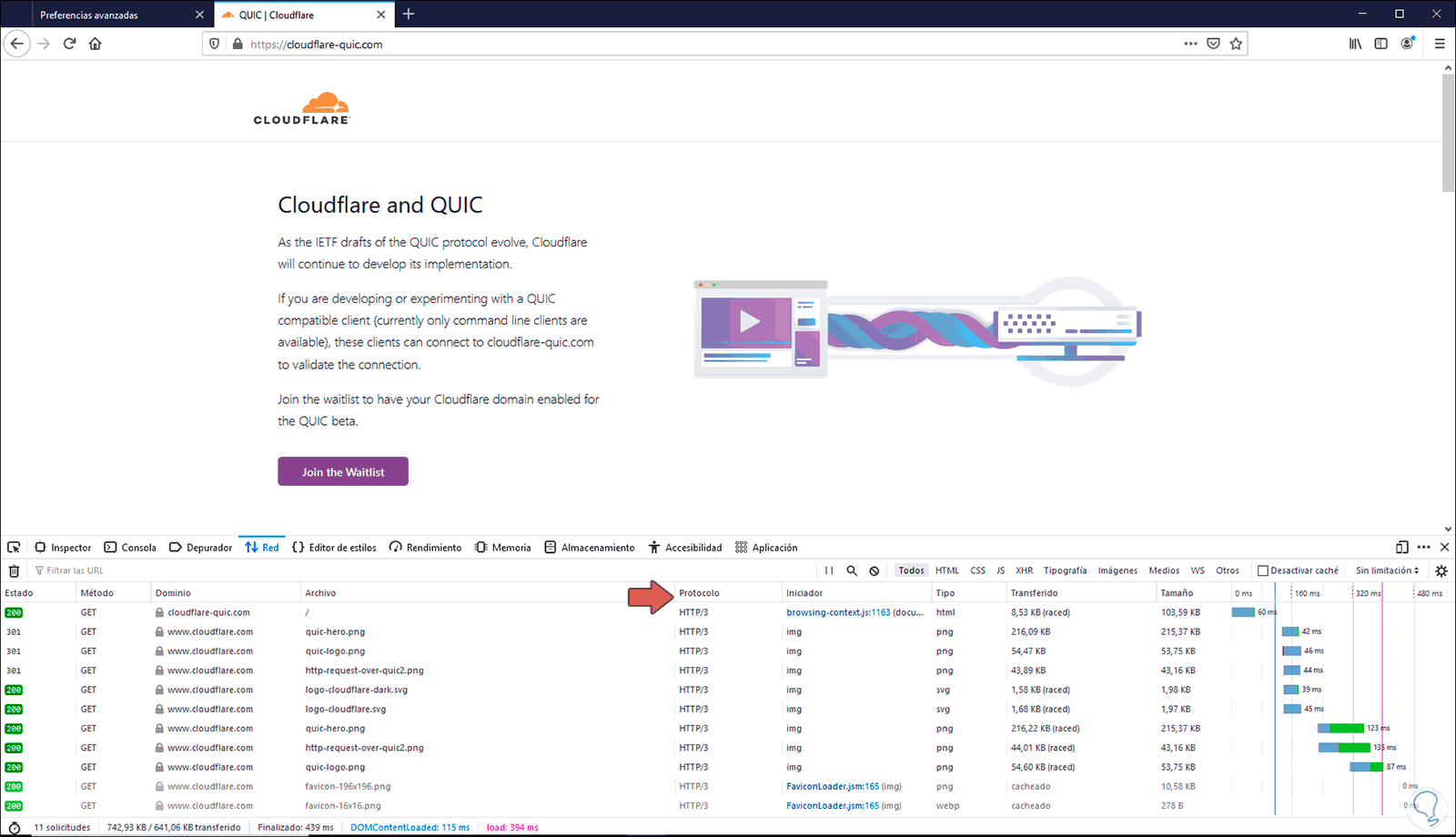 Allí pulsamos la tecla F12 para acceder al Modo desarrollador e iremos a la pestaña “Red”, recargamos la página web y damos clic derecho sobre alguna de las columnas para activar “Protocolo”, con esto podremos ver que el protocolo usado es HTTP3: