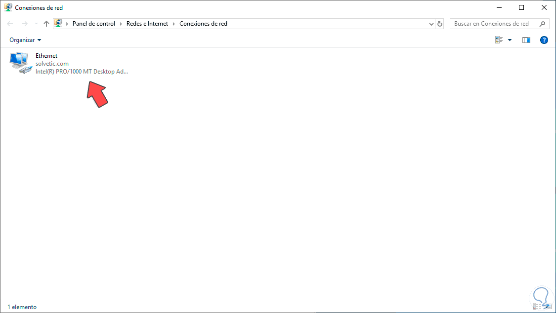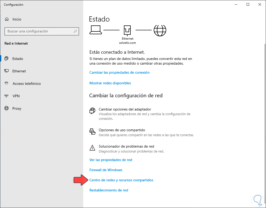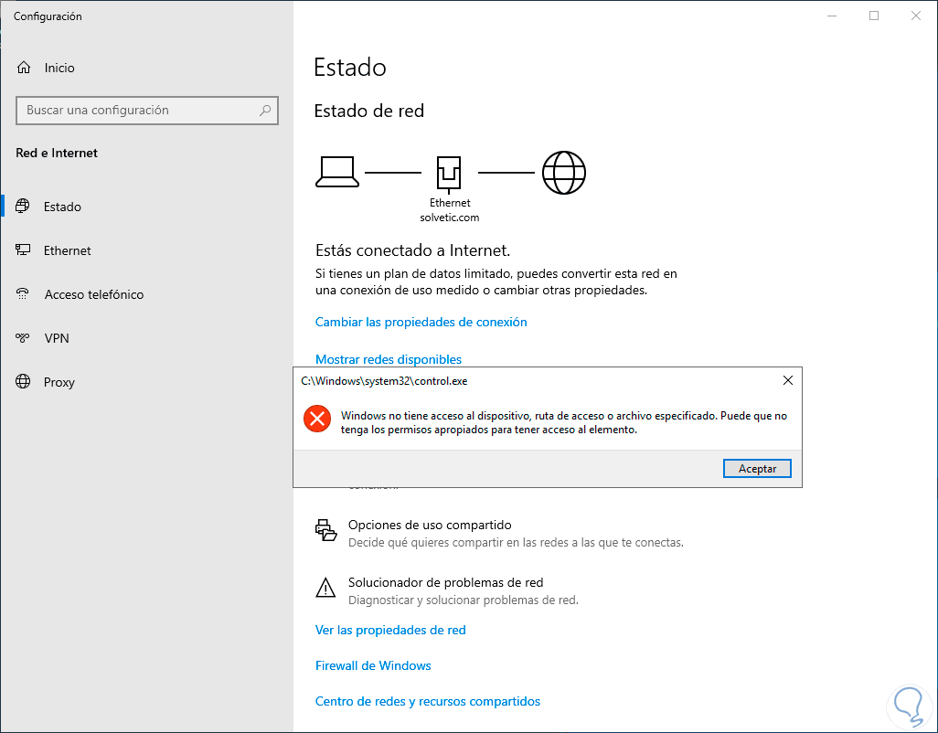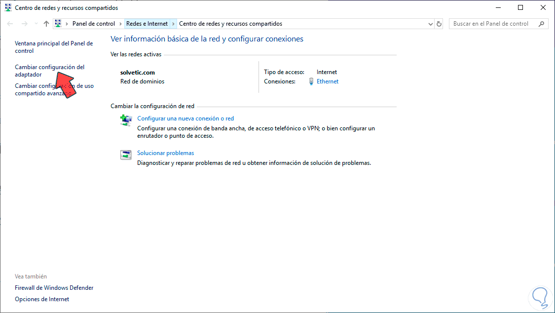 Desde aquí podremos acceder a las propiedades del adaptador y realizar las tareas de gestión sobre este, pero a esta ruta deberíamos acceder dando clic en “Cambiar opciones del adaptador” directamente, pero salta el error, con Solvetic veremos cómo corregir este error en Windows Server 2016 o 2019.