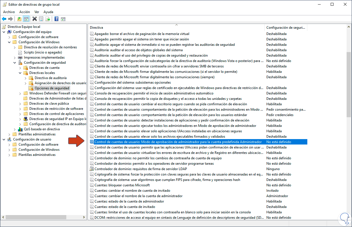 En las políticas desplegadas seleccionamos la política llamada “Control de cuentas de usuario: Modo de aprobación de administrador para la cuenta predefinida Administrador”: