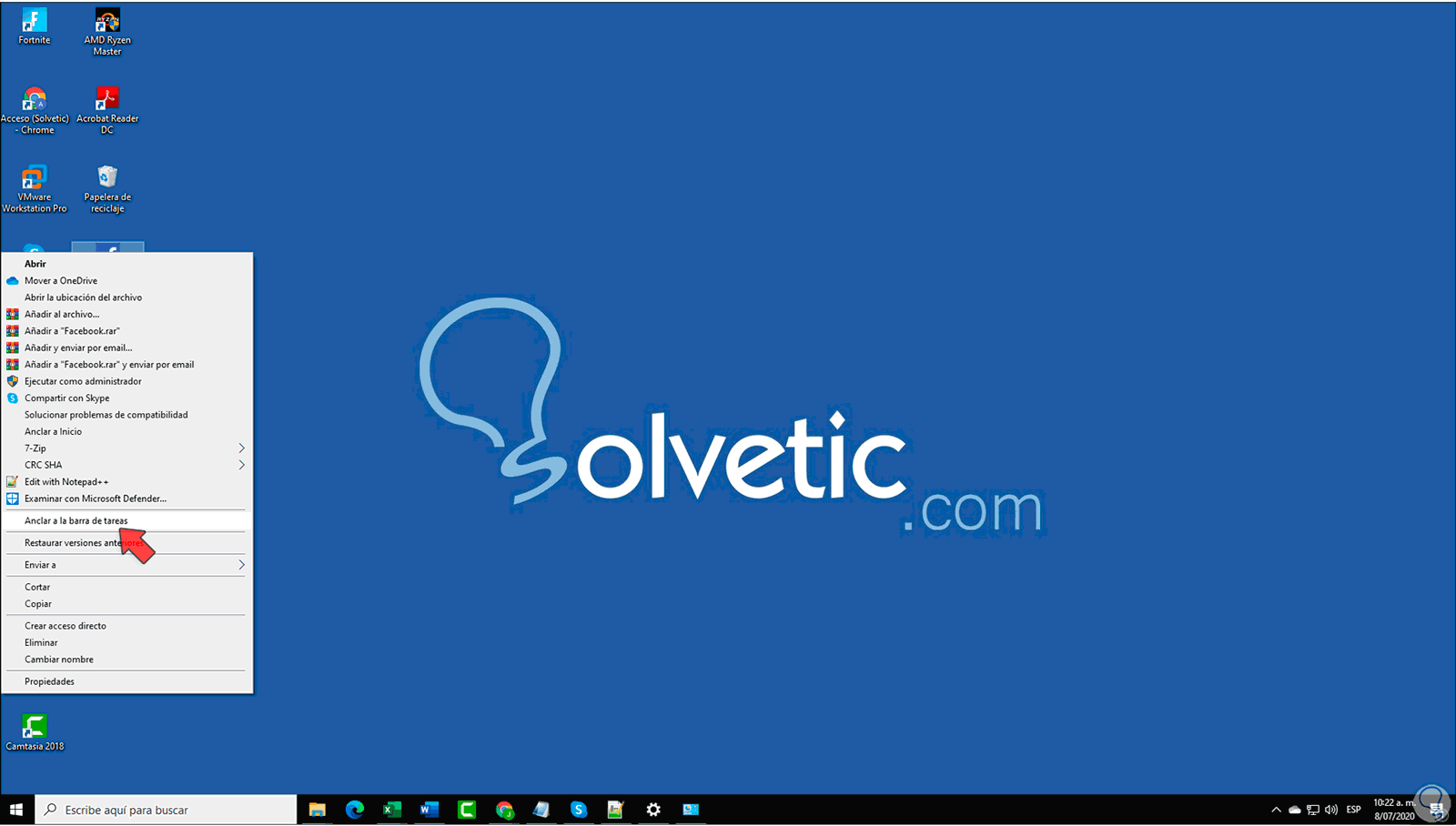 Para esto primero debemos crear el acceso directo en el escritorio de Facebook, una vez allí creado, damos clic derecho sobre el acceso y seleccionamos “Anclar a la barra de tareas”: