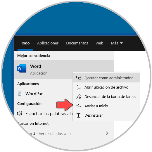 Podemos permitir que Word esté presente en el menú Inicio de Windows 10, para ello en el buscador ingresamos “Word”, damos clic derecho sobre él y seleccionamos “Anclar a Inicio”: