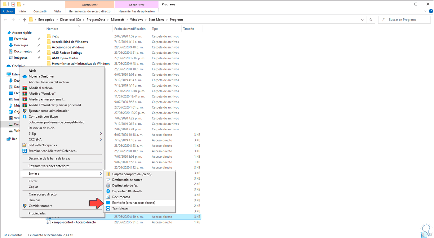 En la nueva ventana que se abrirá damos clic derecho sobre el ícono de Word y seleccionamos “Enviar a - Escritorio (Crear acceso directo)”. Esto creará el acceso a Word en el escritorio.