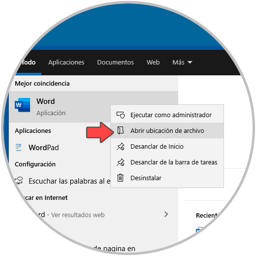 Para esto vamos al buscador del menú Inicio, buscamos Word, damos clic derecho sobre él y seleccionamos “Abrir ubicación del archivo”: