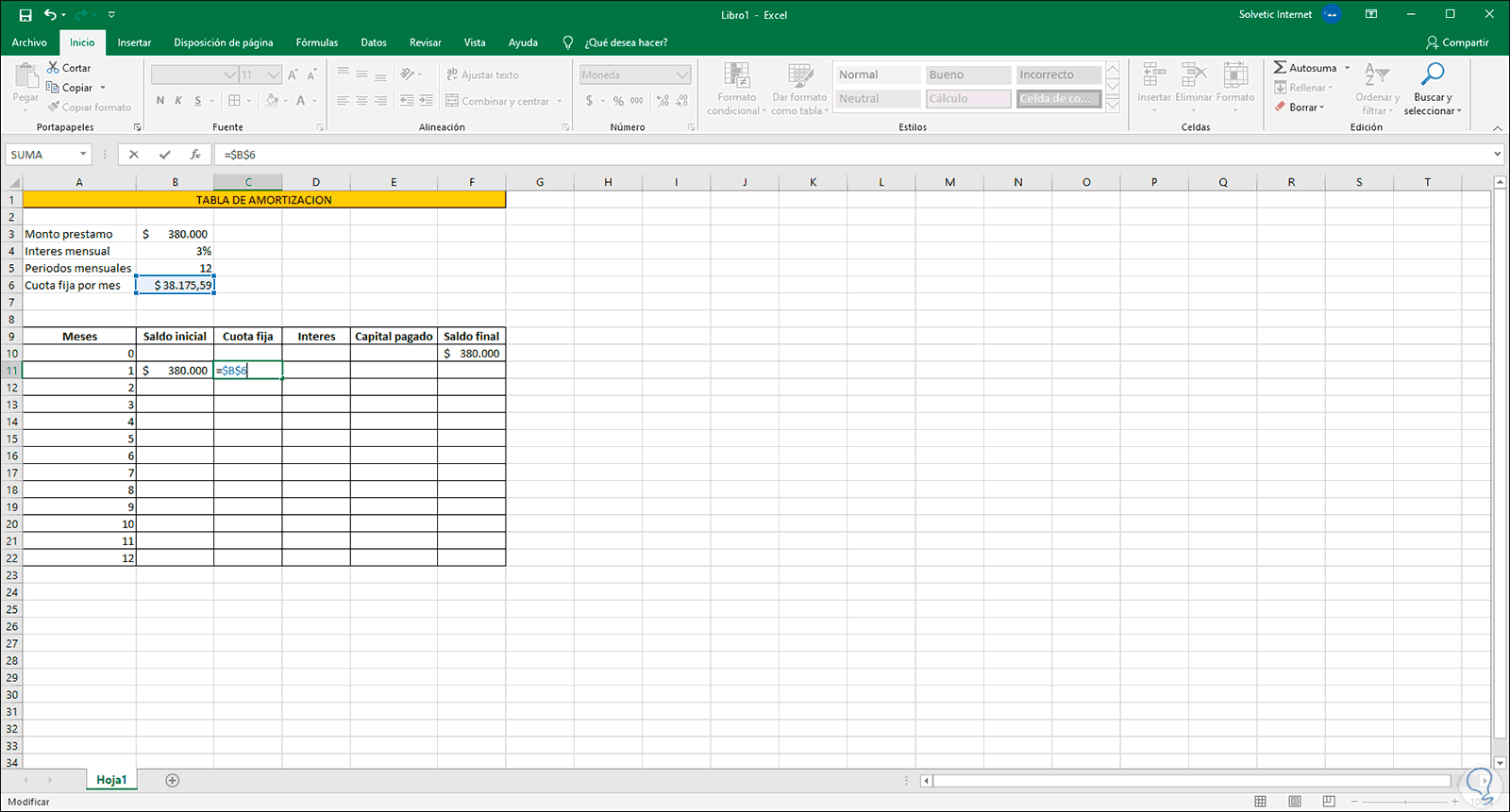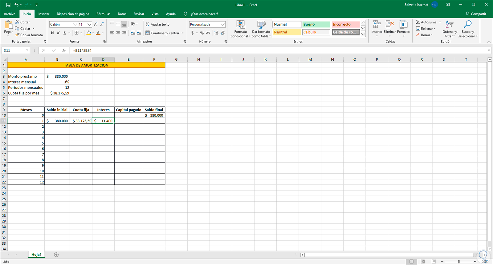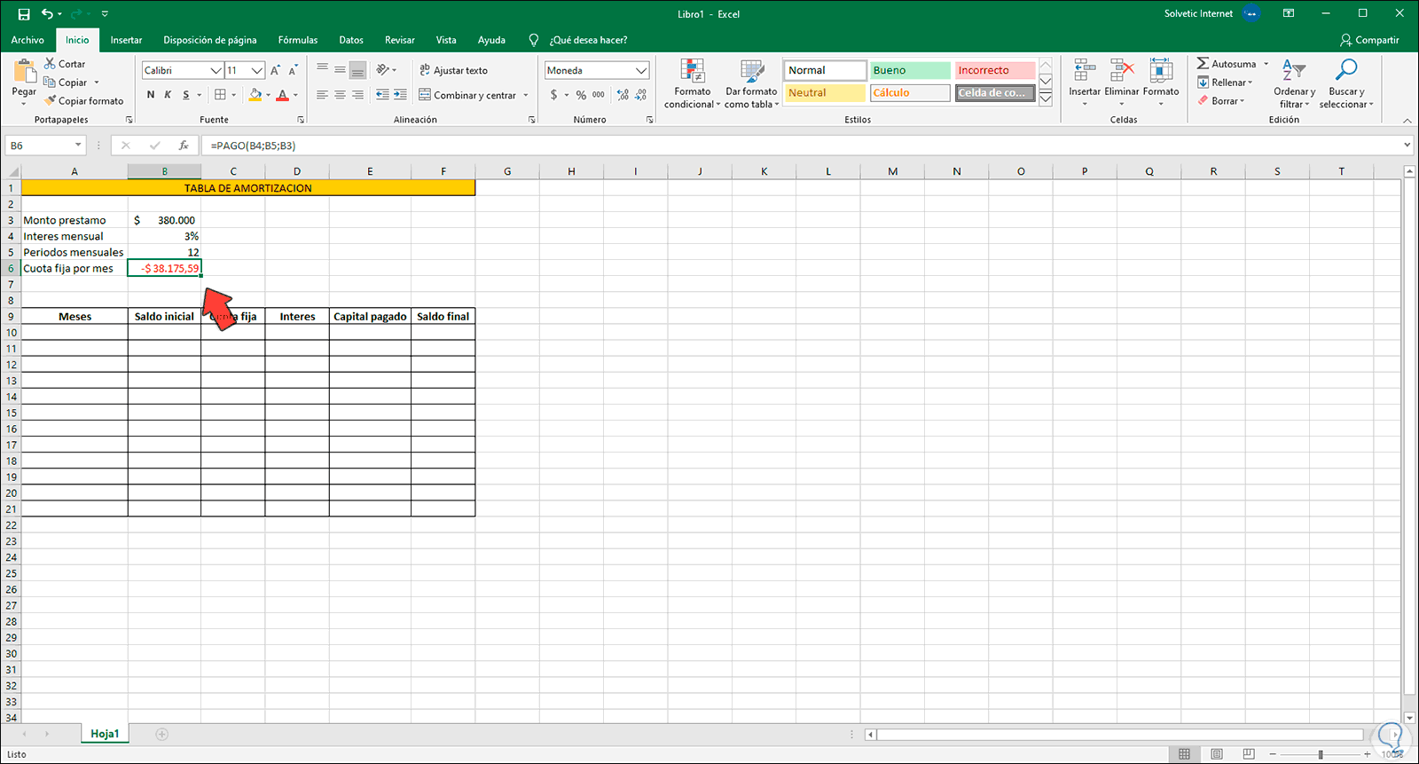 1. Calcular cuota fija Excel