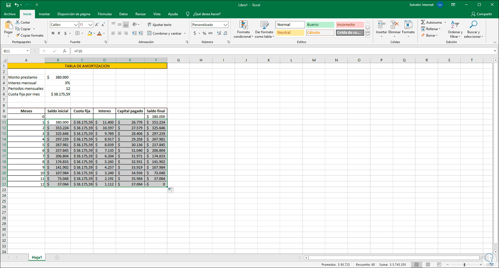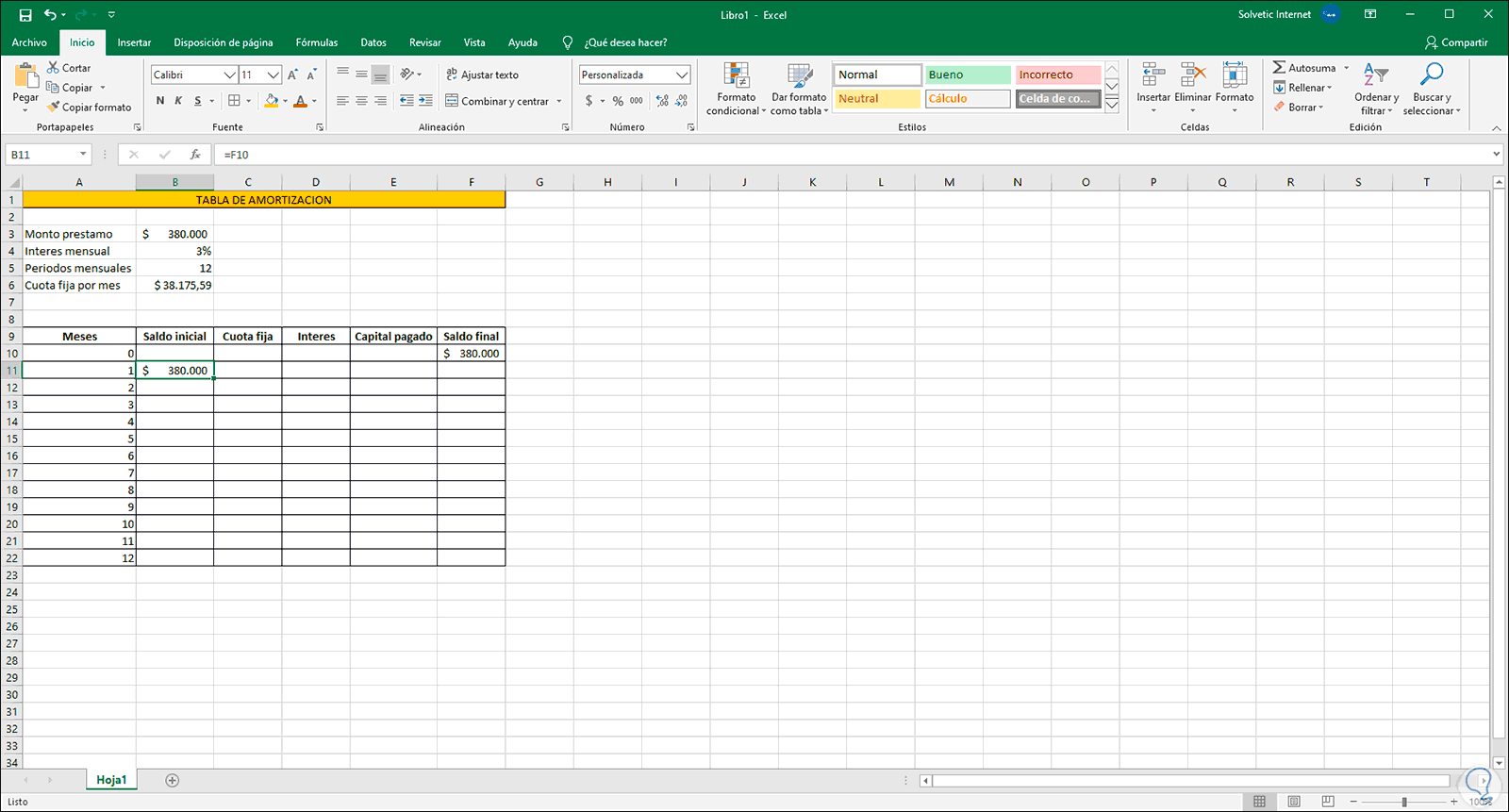 Ahora, la celda F10 que es donde hemos ingresado el monto del préstamo la referenciamos en la celda B11 asociada al saldo inicial del crédito:
