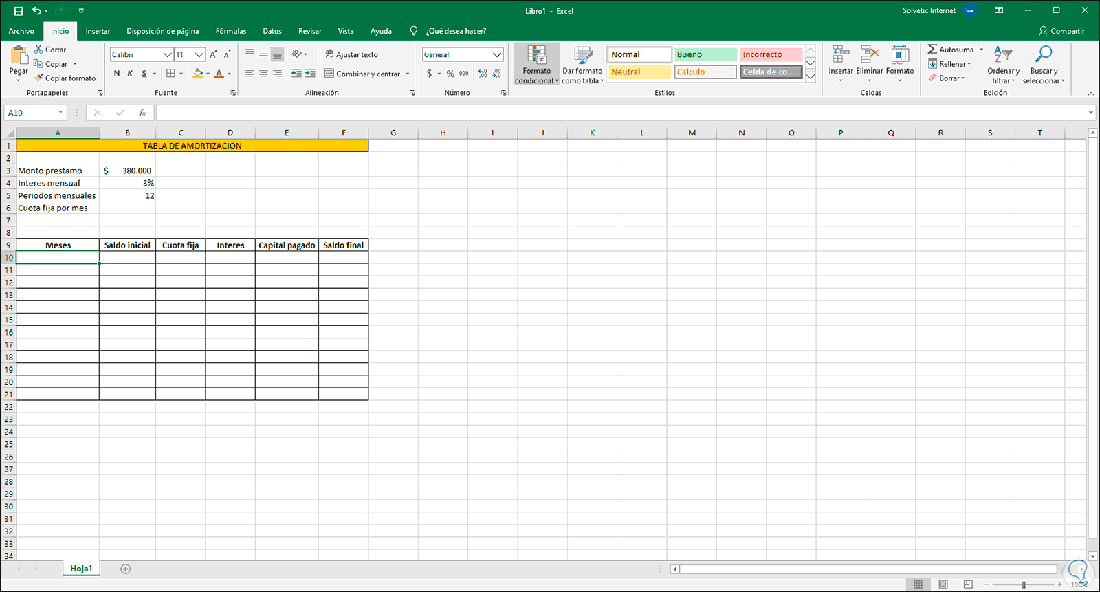 2. Configurar tabla de amortización Excel