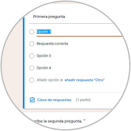 Después de esto es momento de definir las respuestas correctas, para ello seleccionamos la primera pregunta y damos clic sobre la línea “Clave de respuesta”: