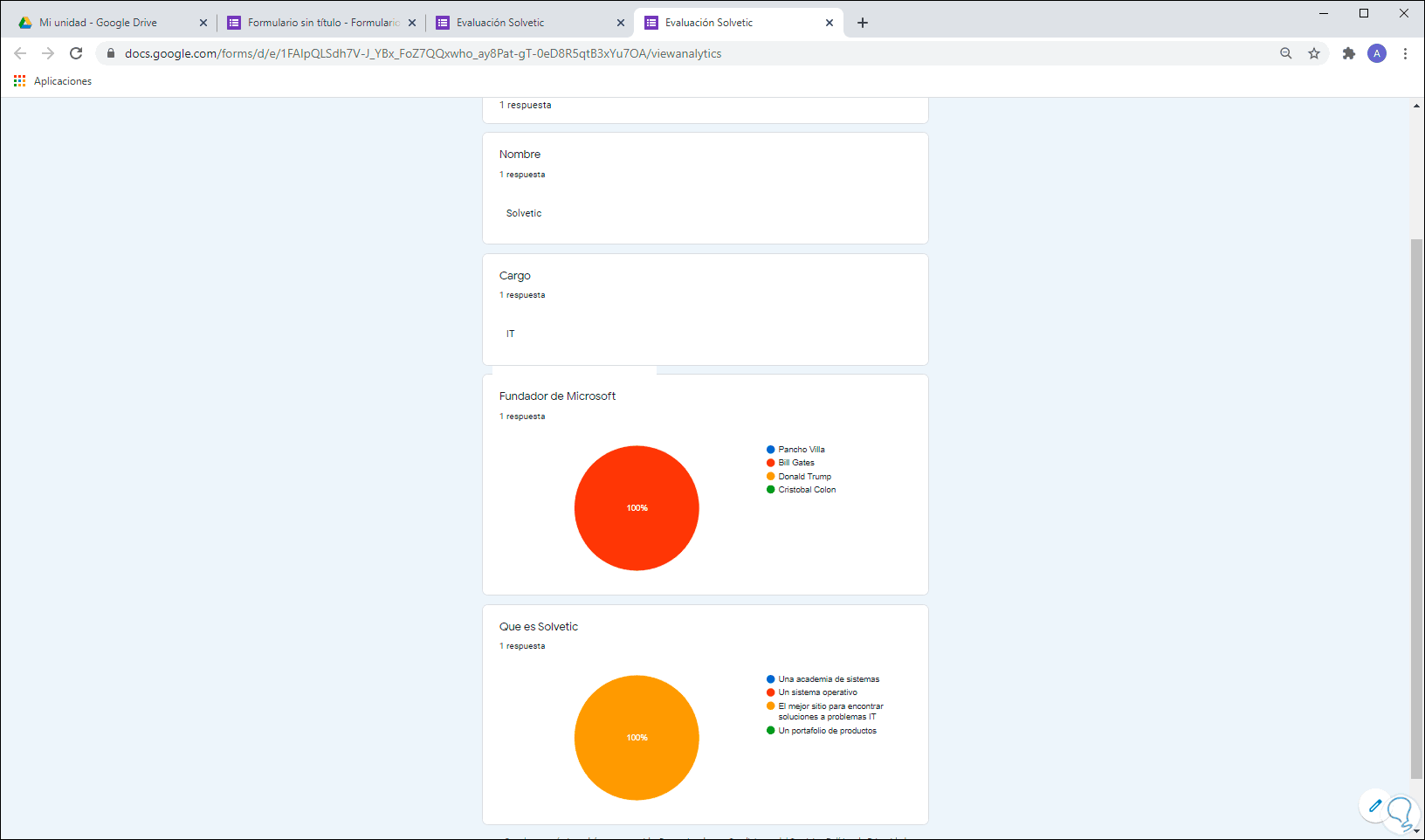 Desde el formulario de Google Drive podemos ir a la sección “Respuestas” para ver detalles como: