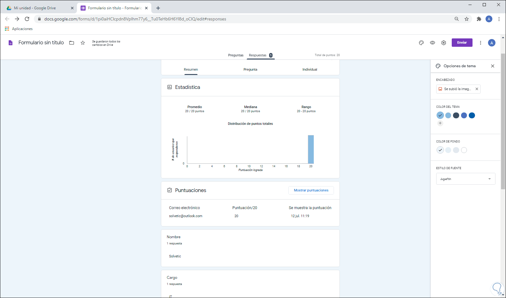 Como esta será una prueba de evaluación, dejaremos activa la casilla “Inmediatamente después de cada entrega” en la sección “Mostrar calificación” para que se acceda al resultado final, en la sección “la persona que responde puede ver” podemos establecer que variables tendrán visibilidad para el usuario activando las casillas respectivas, definido esto damos clic en “Guardar” y veremos lo siguiente: