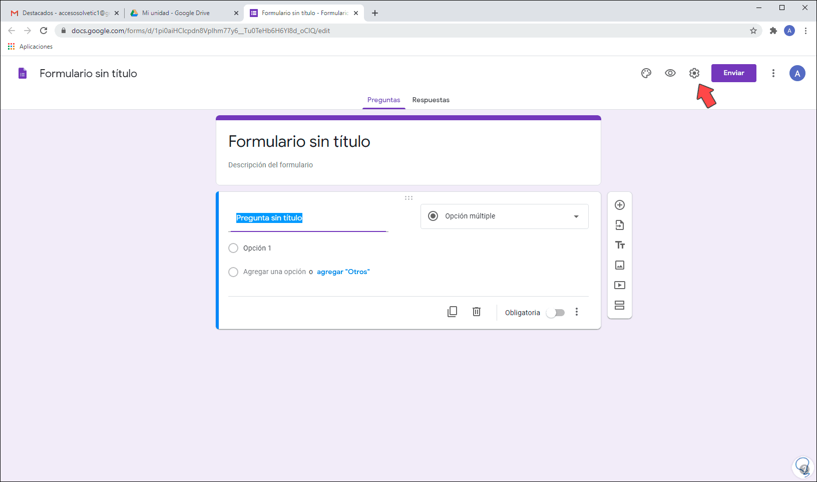 Allí vamos a crear el formulario con el diseño de evaluación o test, para ello damos clic sobre el icono de engranaje en la parte superior y veremos lo siguiente: